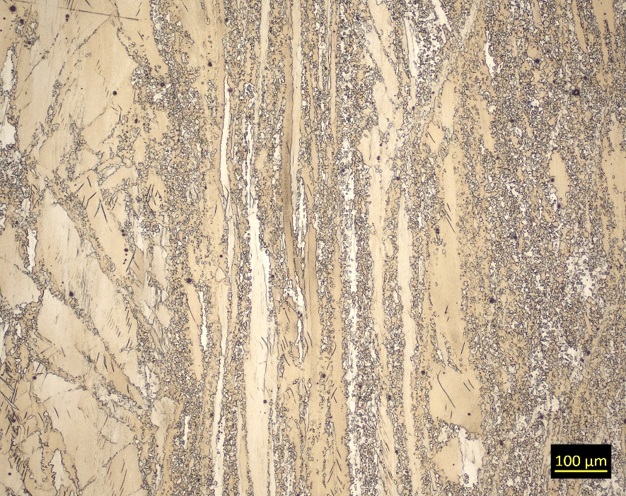 Struttura: matrice con grani di fase α, contenenti geminati, e con allineamenti di grani di fase β molto sottili, non risolti con questo ingrandimento.