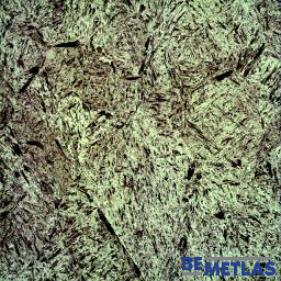 Struttura: aghi scuri di bainite inferiore in martensite cubica grossolana, tipica del surriscaldamento in austenitizzazione.